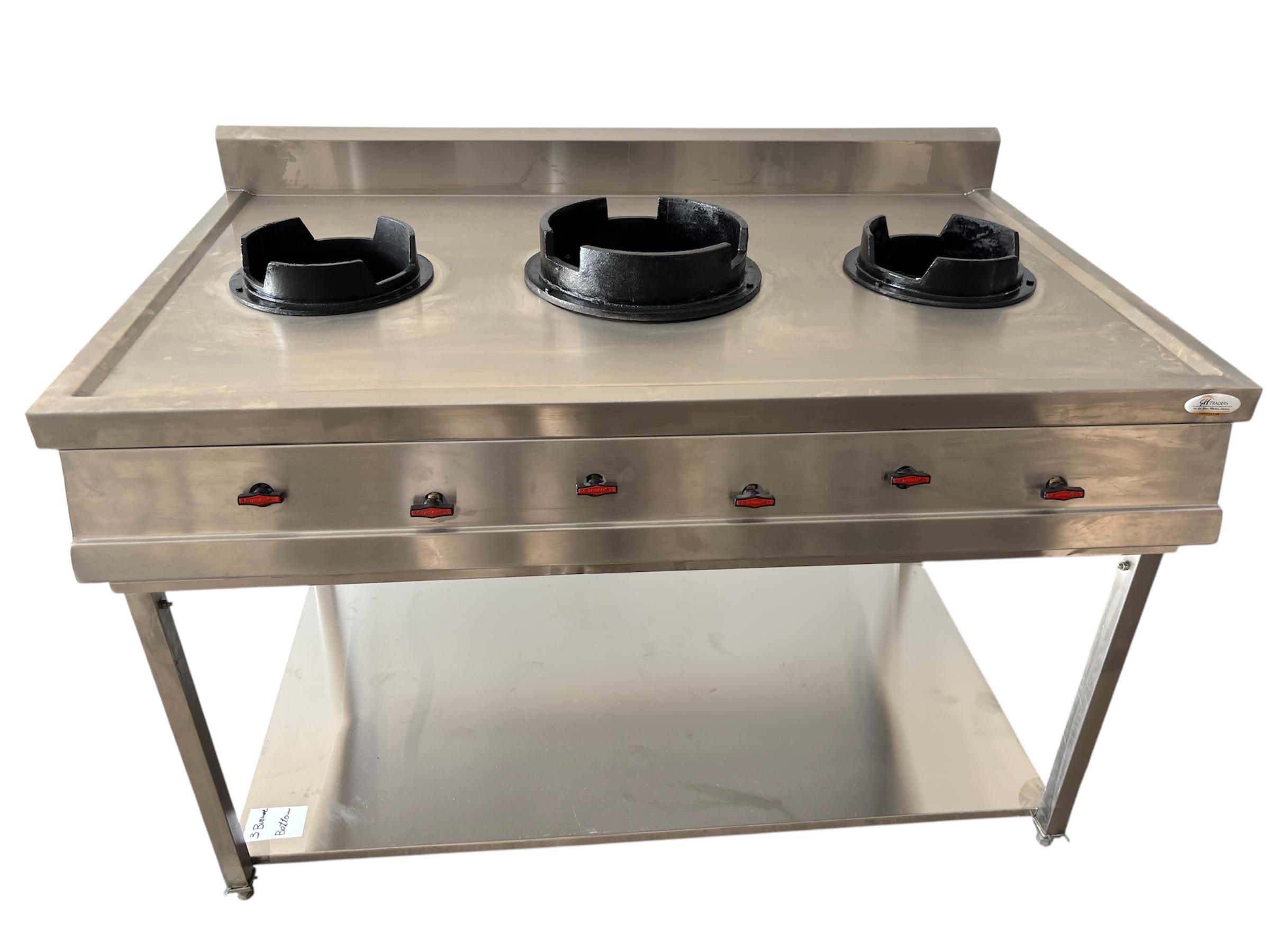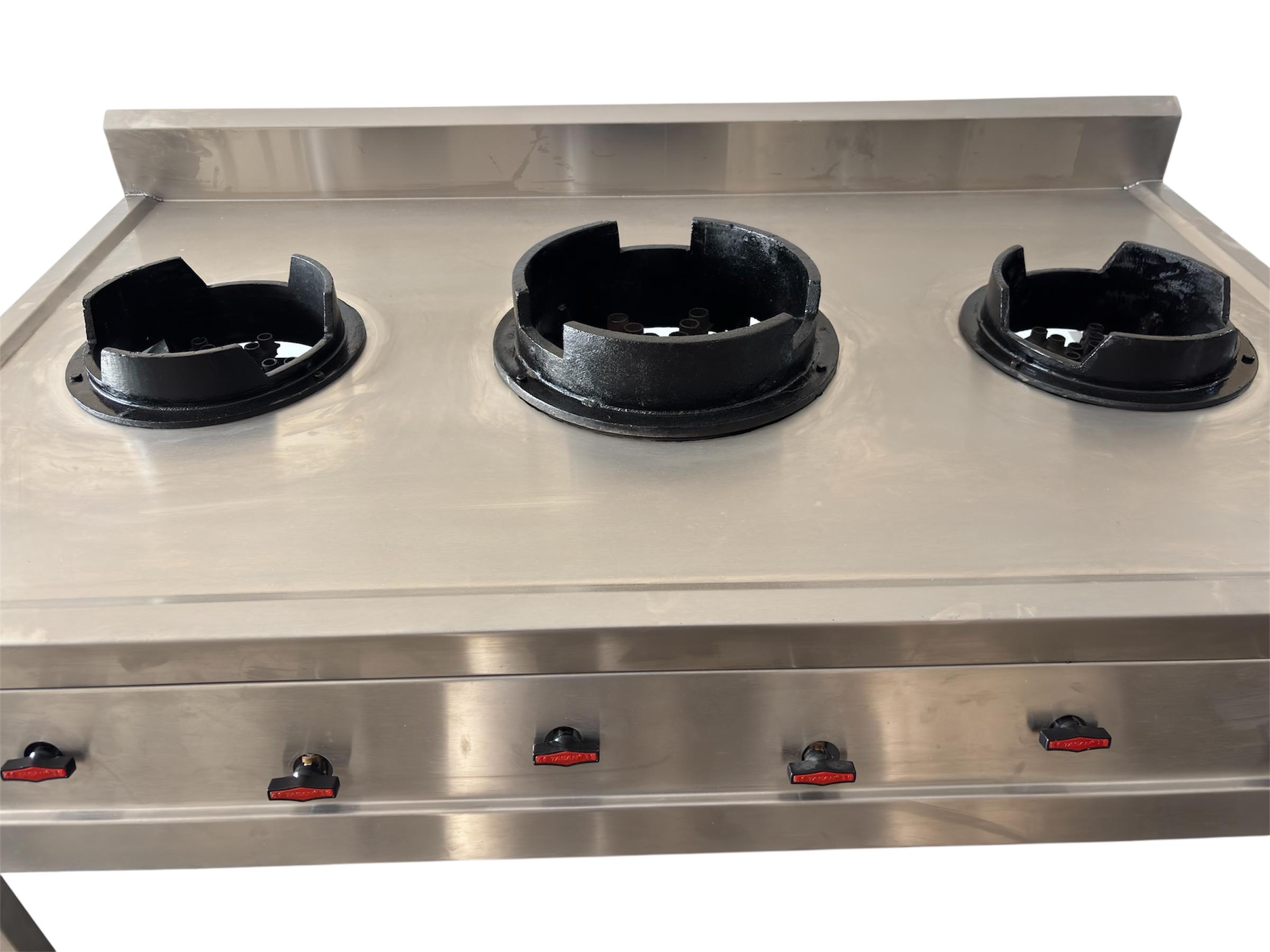 Heavy-duty 3-wok burner setup, ideal for commercial Chinese/Asian kitchens